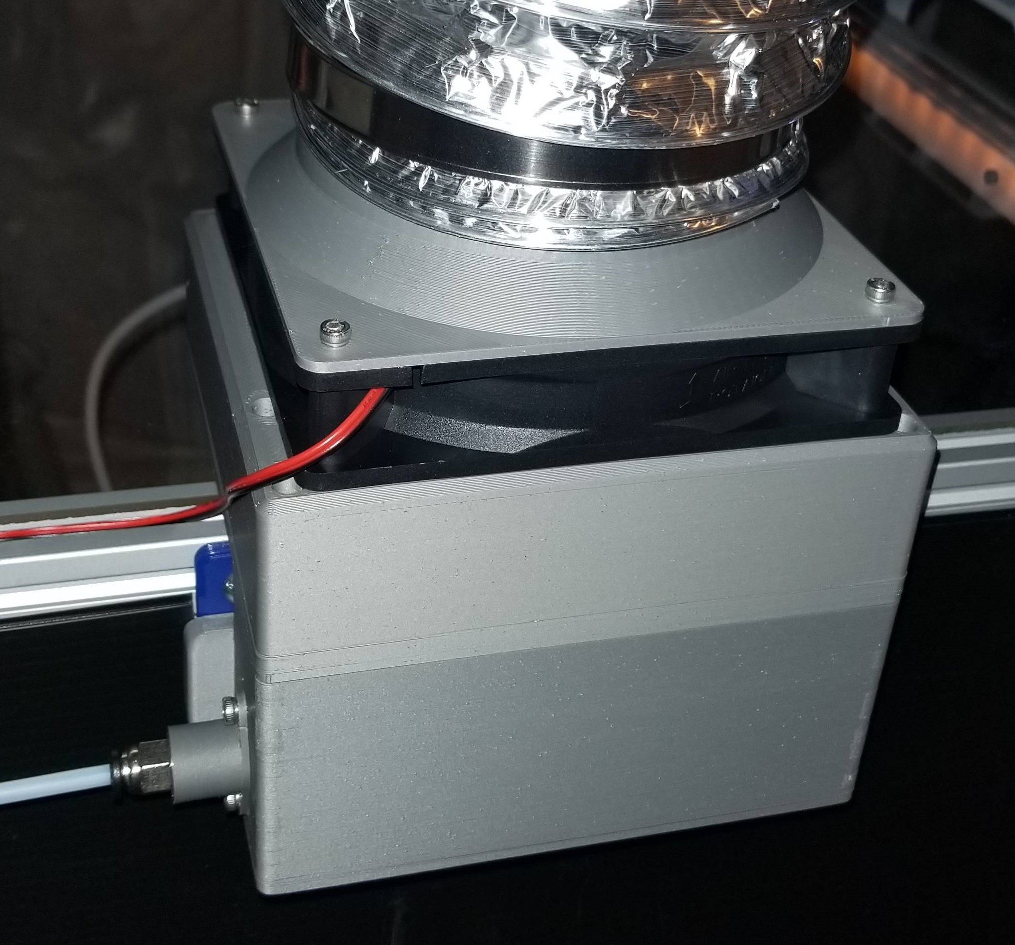 This mod allows use of a 120mm fan and includes an adapter to connect a 4in duct. It does not include space for filters. The bowden adapter has been moved to side entry.