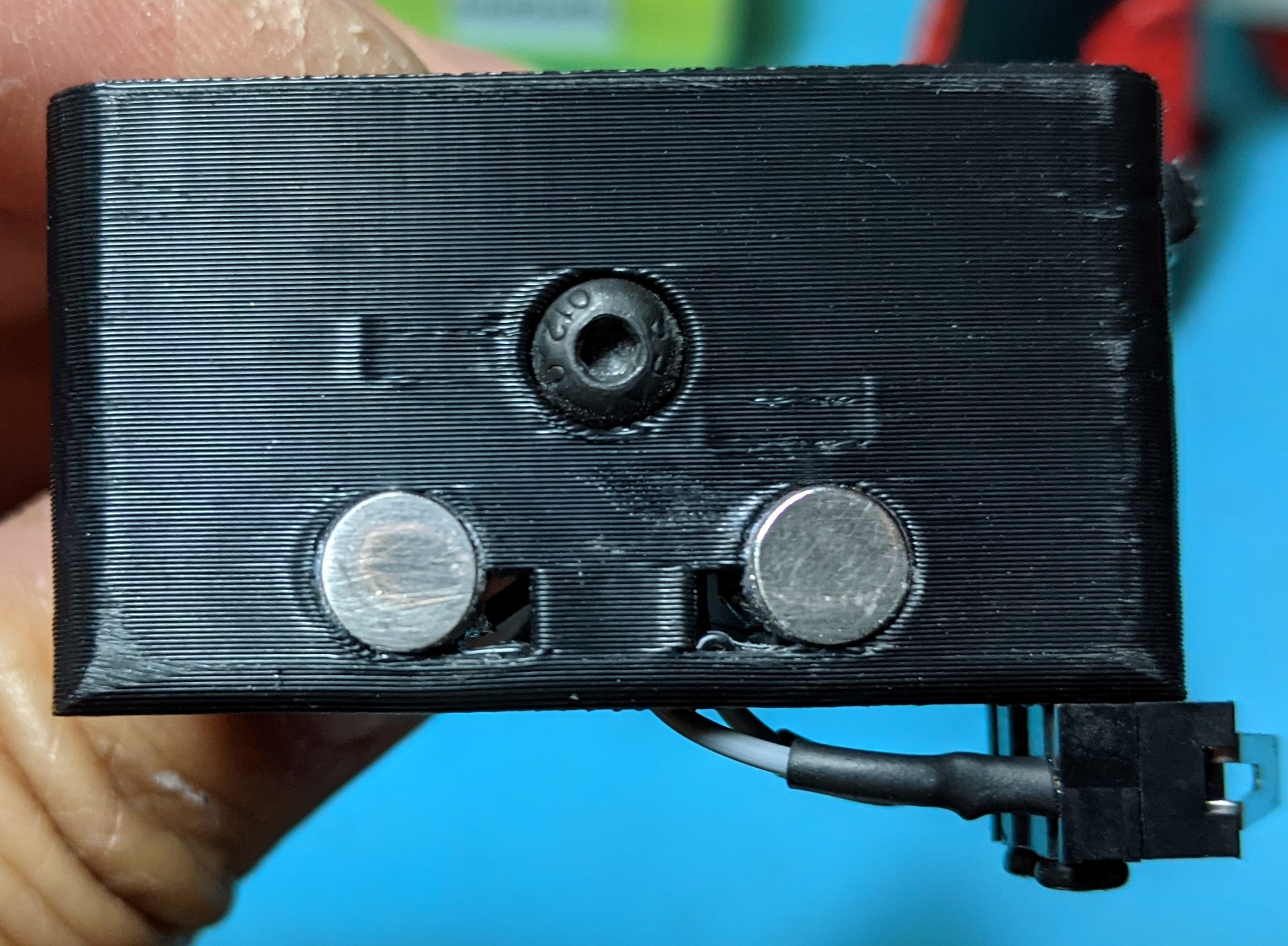 - Place the second magnet on the soldered magnet, and then press the two magnets into the hole so the unsoldered magnet is out. The magnets should sit “proud” of the carriage.