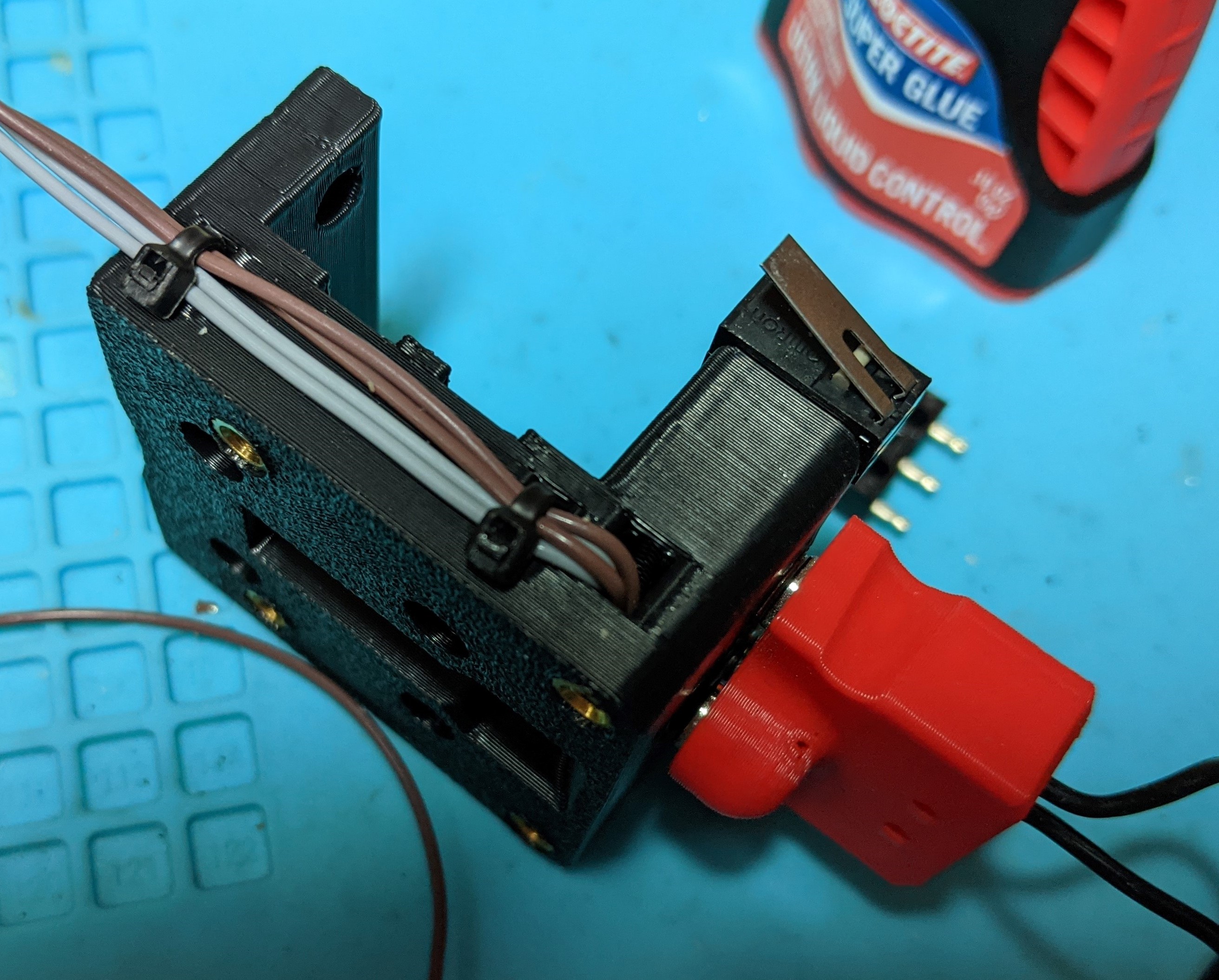 • Screw in two of the m2x10 or m2x12 self-tapping screws (silver ones on the red pictured magprobe below) prior to soldering the microswitch in. Take care not to damage the wires.