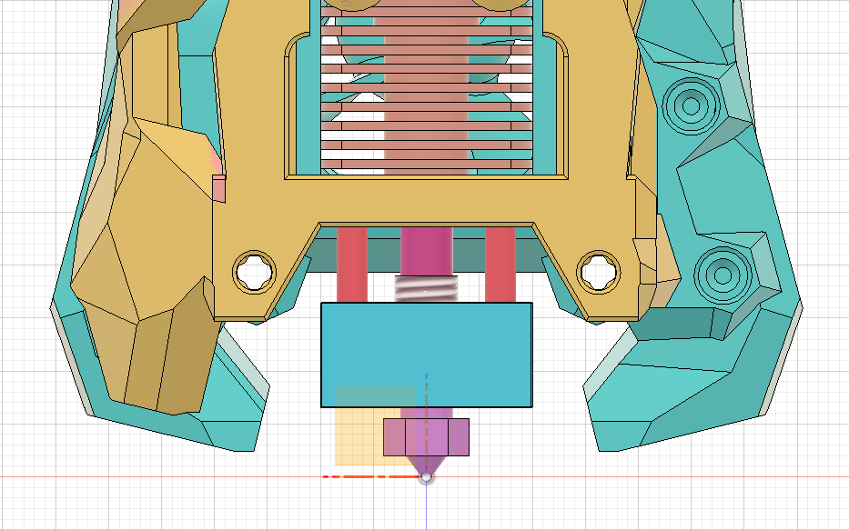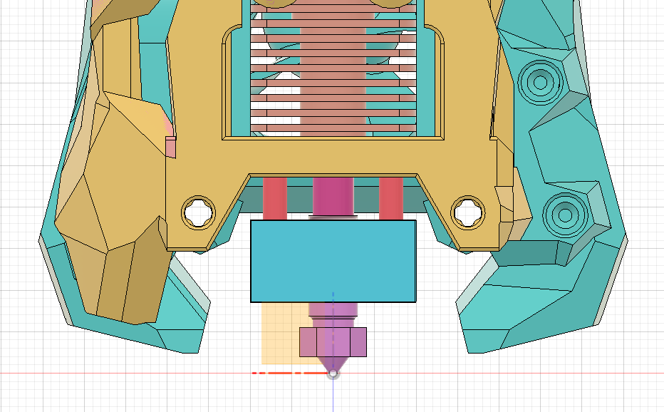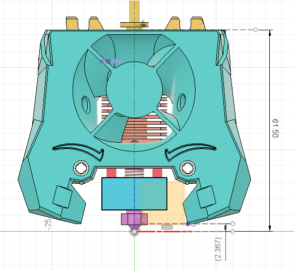 The specified position for the nozzle is 61.5mm from the flat surface at the top of the toolhead. All other dimension are derived from this, and the distance between nozzle tip and duct may be different for other toolheads. On this toolhead the clearance distance is 2.37mm from the tip of the nozzle to the lowest point on the duct as shown. You can check with an allen key set by setting the nozzle height to the bed and lifting the toolhead 0.1mm (or less) at a time until a 2.5mm allen key fits under the duct. It is to be expected that nozzles and heatbreaks might differ in length slightly so +/- 0.2mm should be well within spec.