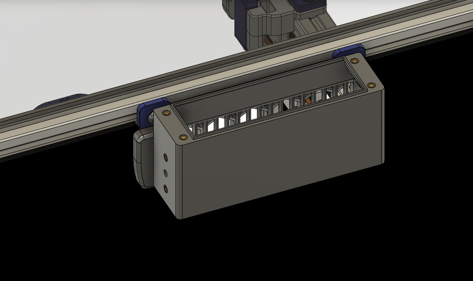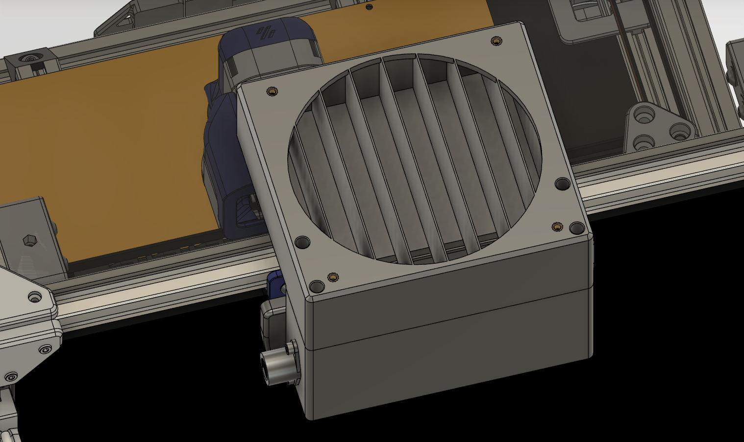 This mod allows use of a 120mm fan and includes an adapter to connect a 4in duct. It does not include space for filters. The bowden adapter has been moved to side entry.