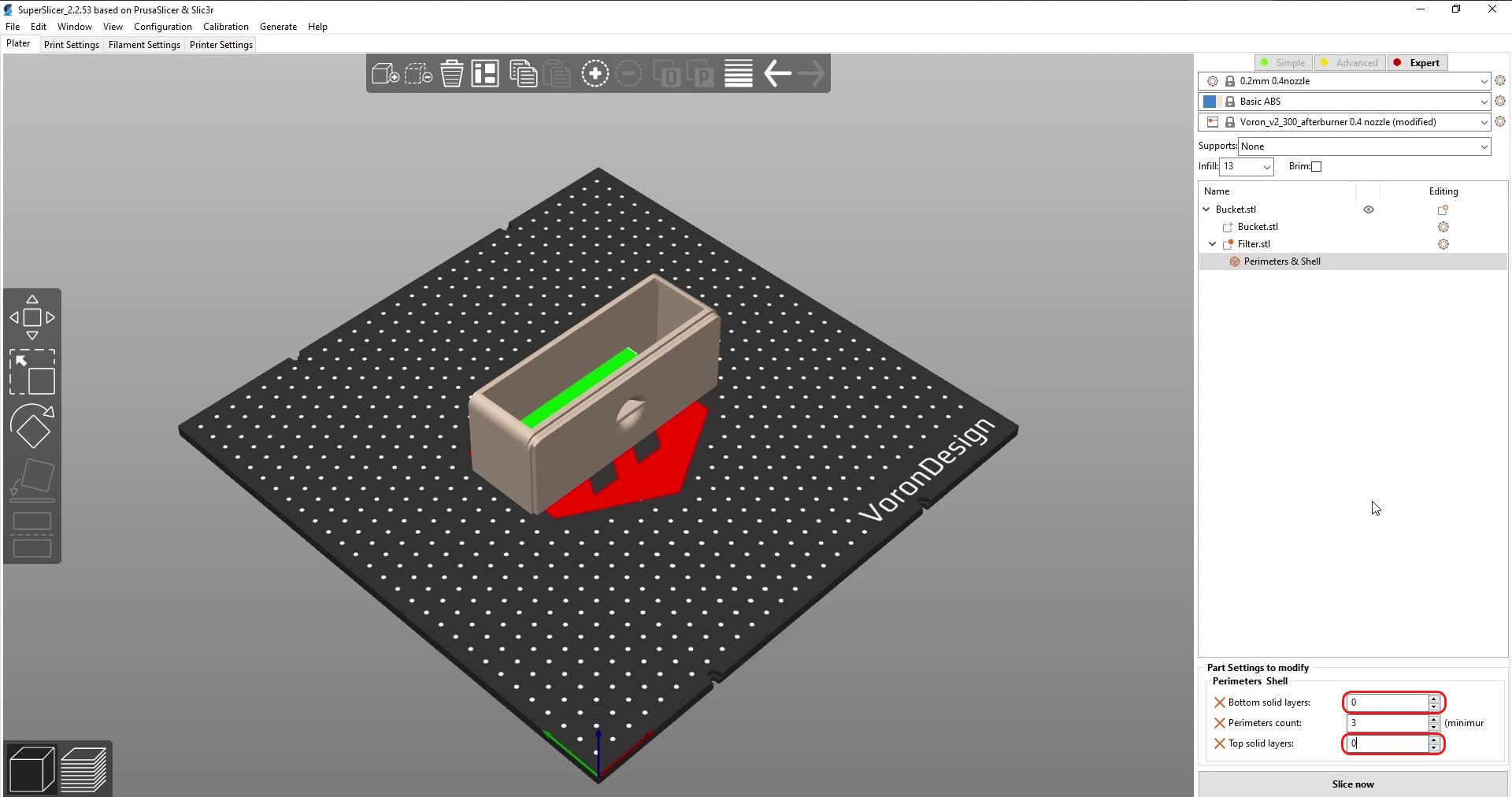 I have attached a few screenshots of how to prepare the print with the filter dummy file. The green options shown in the last two screenshots are optional. Either you set the infill of the whole bucket higher or you add another setting for the filter dummy. Except for the top end, the print consists of walls only. Make sure that the filter dummy and the bucket are centered. If you want to move them, then select both at the same time so you don't change the cropping area.