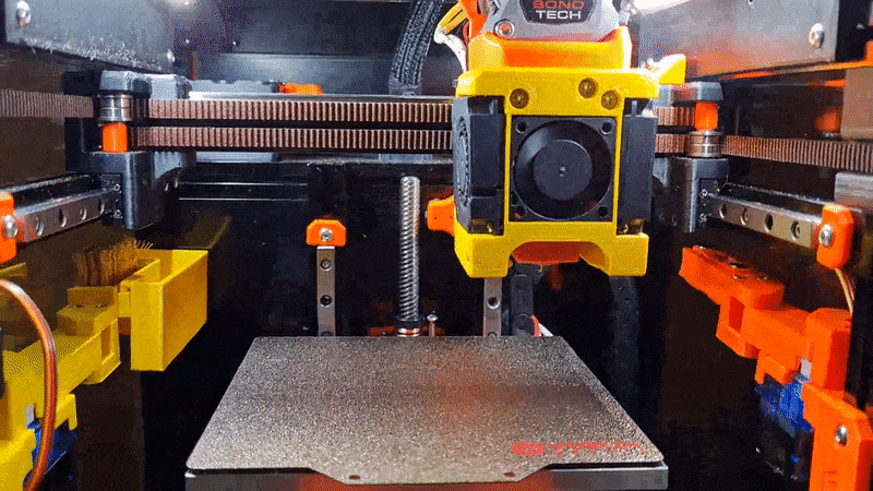 It uses a snap in frame clip, that doesn't require screws, to attach a servo that extends a bucket and brush over the build plate for the hotend nozzle to clean it of filament debris for cleaner prints.