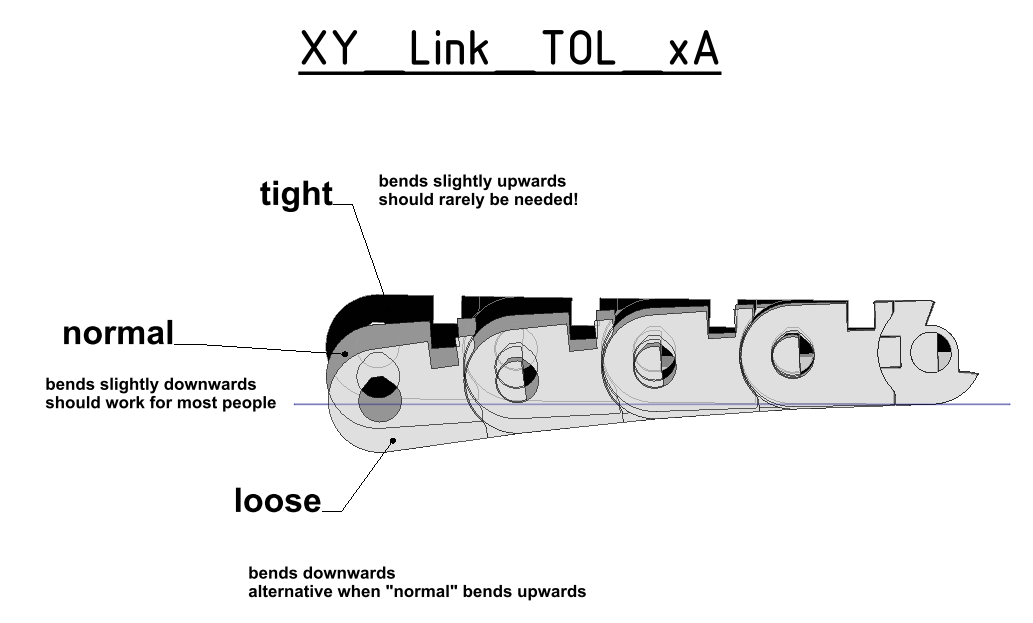 Do A TEST PRINT OF 3-4 XY-LINKS PER TOLERANCE FIRST o CHECK FOR LAYER ADHESION o CHECK which tolerance version fits your printer filament/temperature best: XY_Link_tight_xA: might have slight upwards bending XY_Link_normal_xA: should be pretty flat (should work for most ppl!) XY_Link_loose_xA: should bend downwards