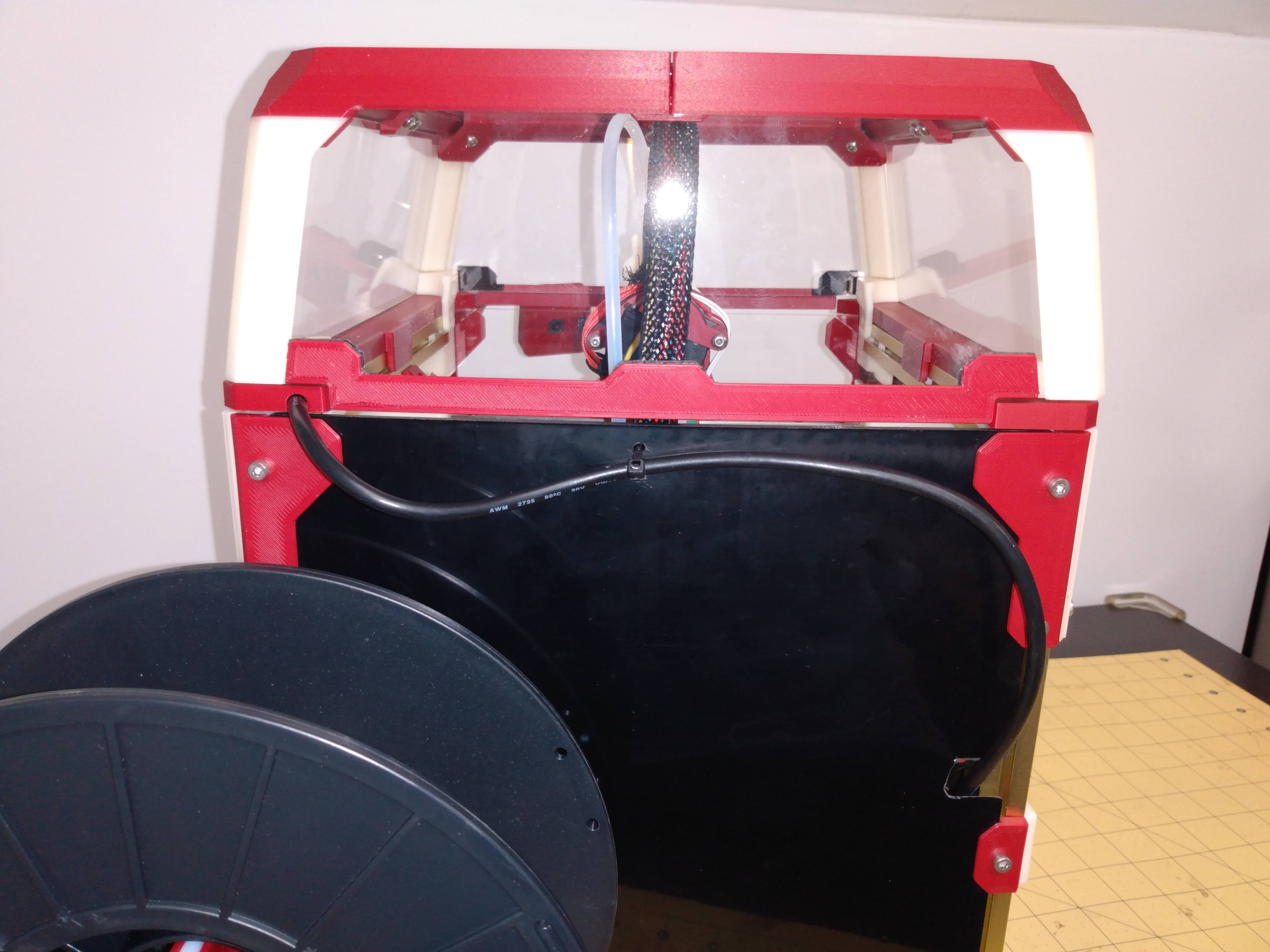 When routing the USB cable through the back panel, take care to keep the cable from interfering with the filament spool. You may need to drill a couple of holes for a zip-tie or two to hold the cable against the panel. Many ways to do this. I cut a slit on the far side of my panel as shown below.