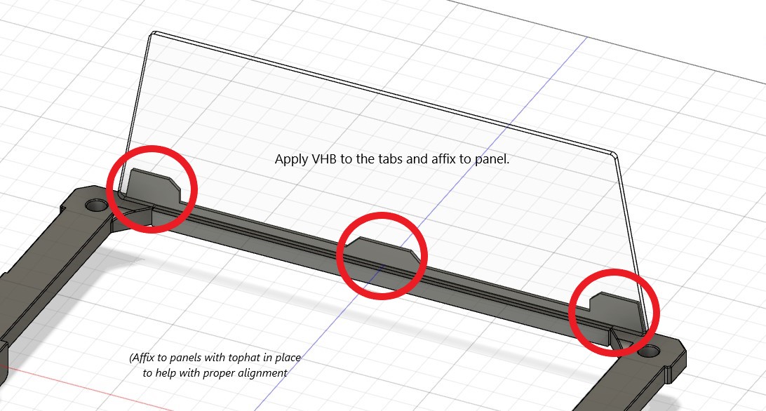 Place the tophat in place on the left/right spacers and intall the front/rear spacers. It will help to open the door and remove the back panel for this step. Hint for split spacers. Apply VHB across seam before attaching to panel. (Be careful that each panel rests firmly on the shelf of the spacer.)