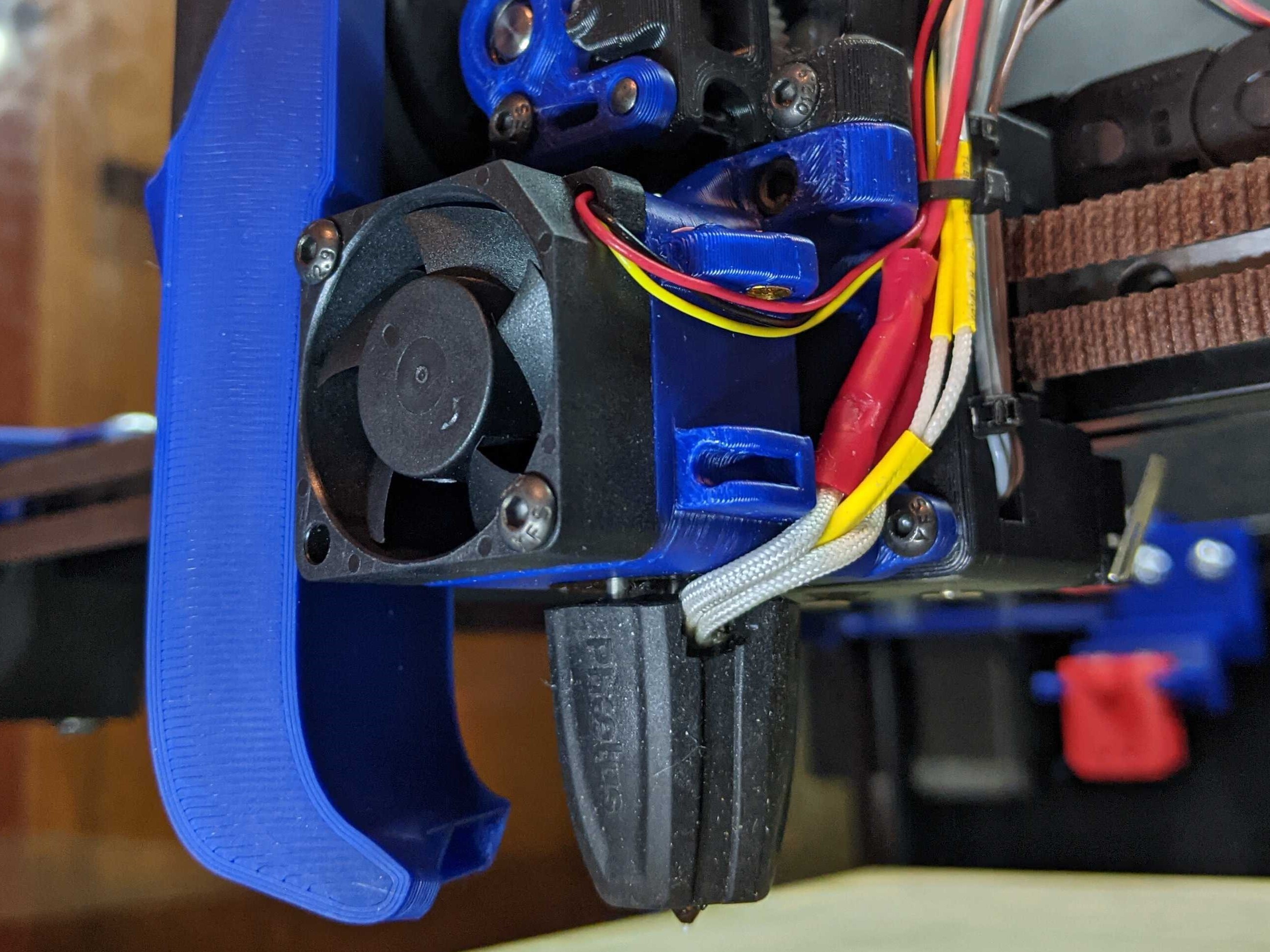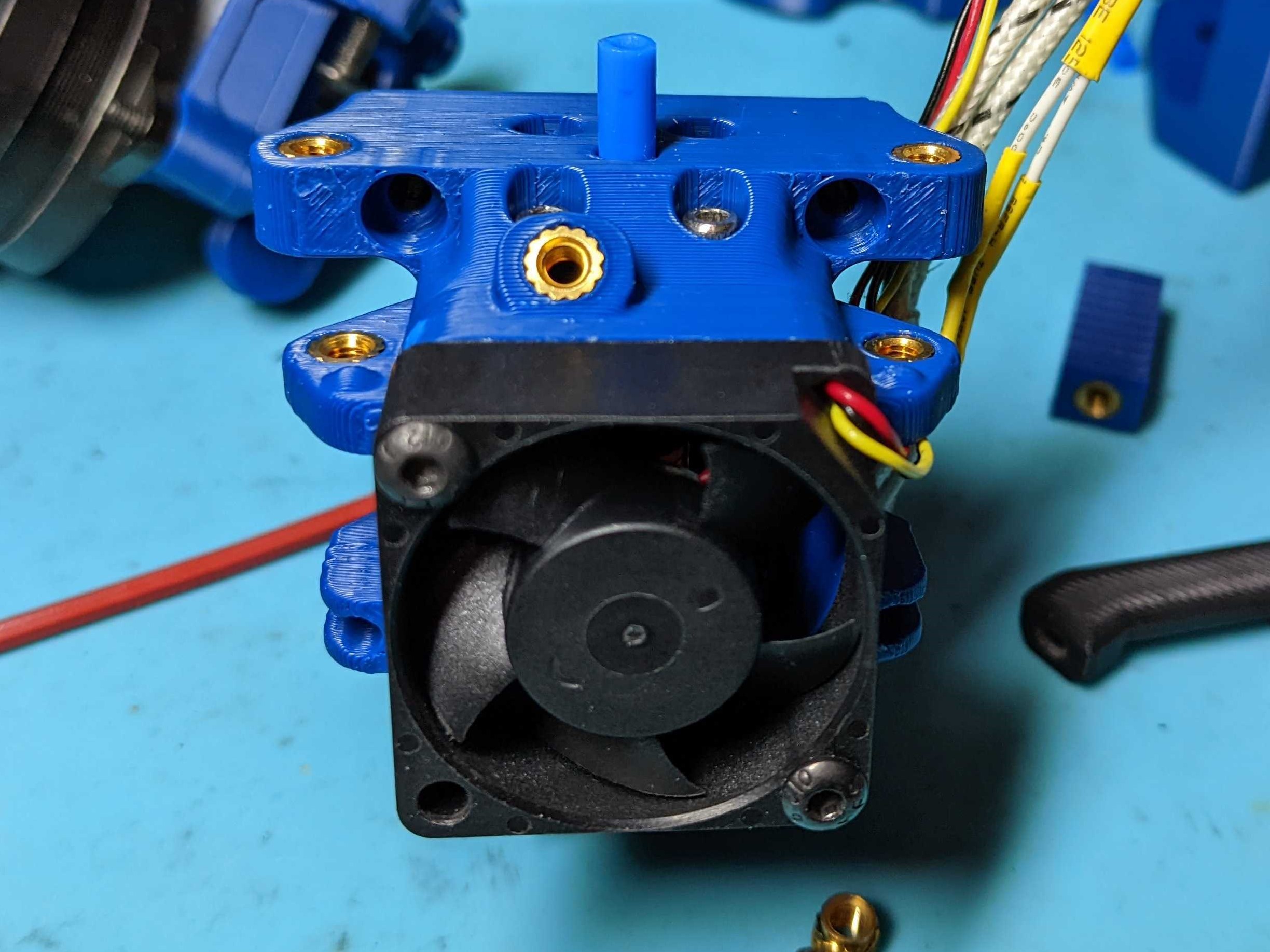 • Uses a slightly modified hotend mount that rotates the heatsink slightly. This is to allow the Rapido sock to be mounted symmetrically at the bottom with the logo forward.