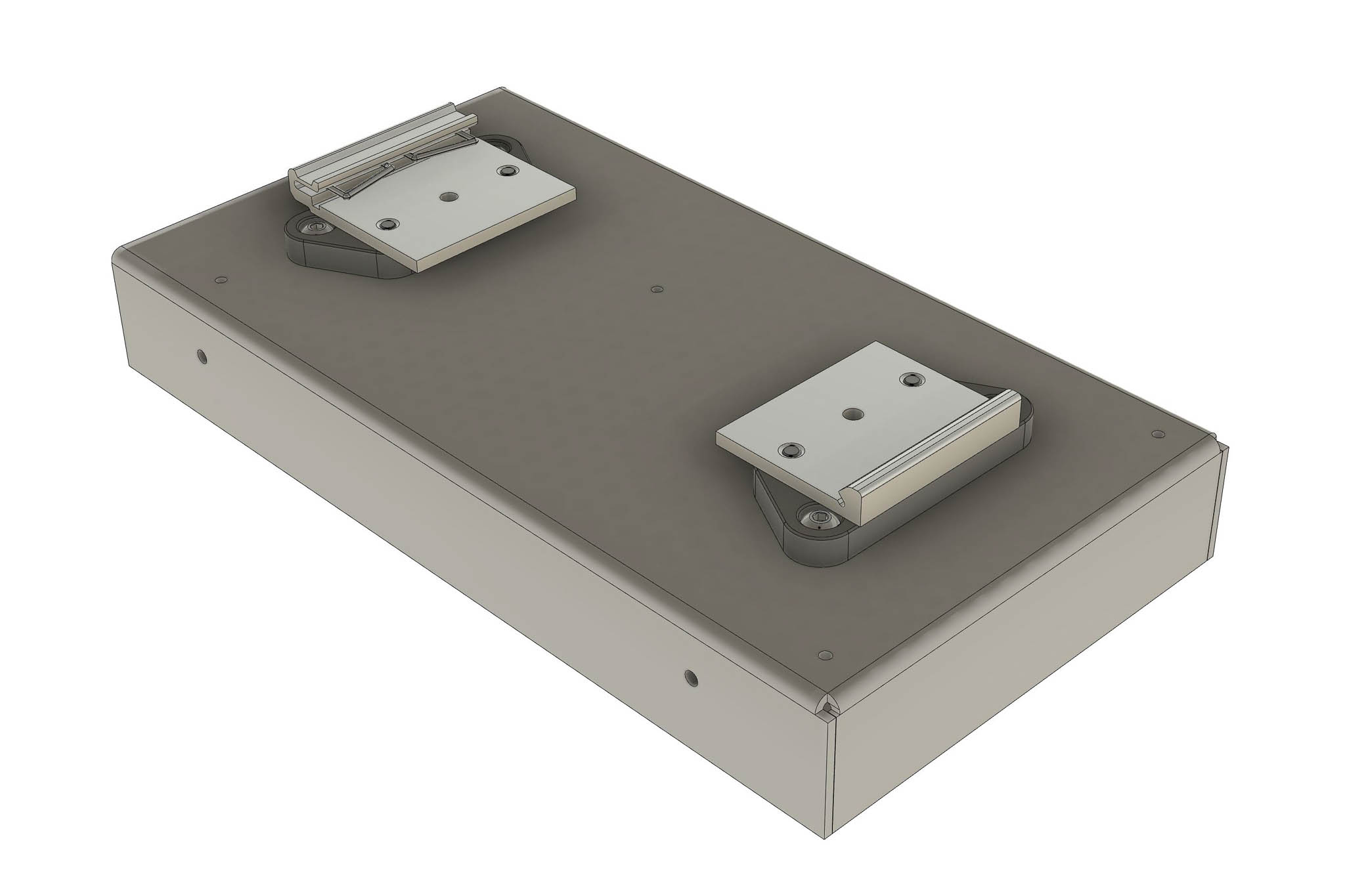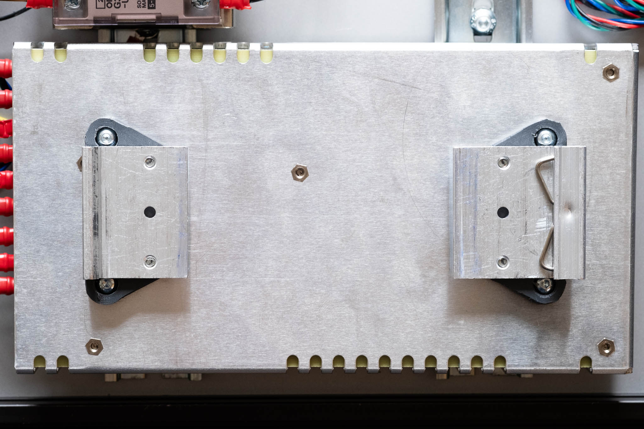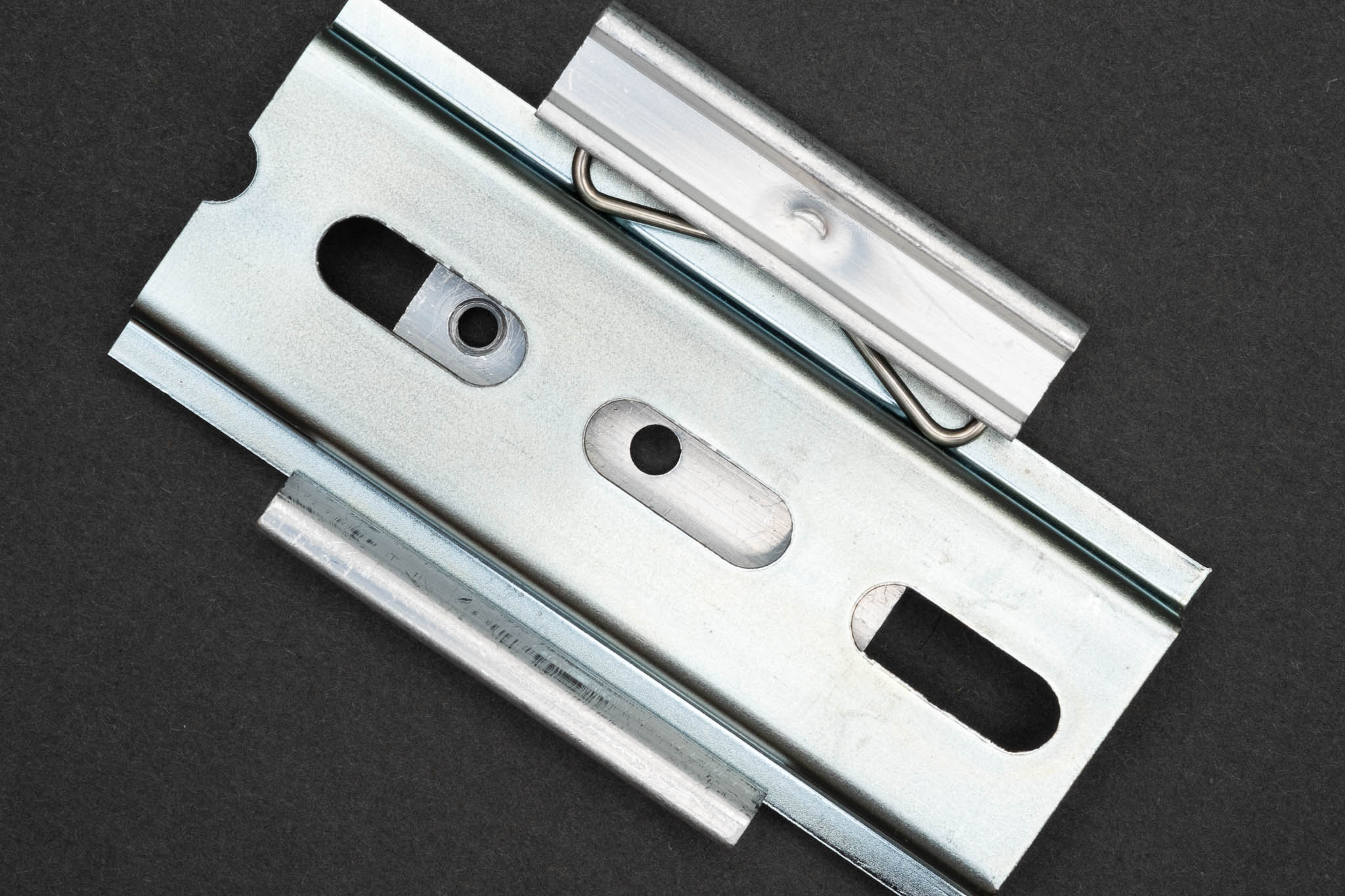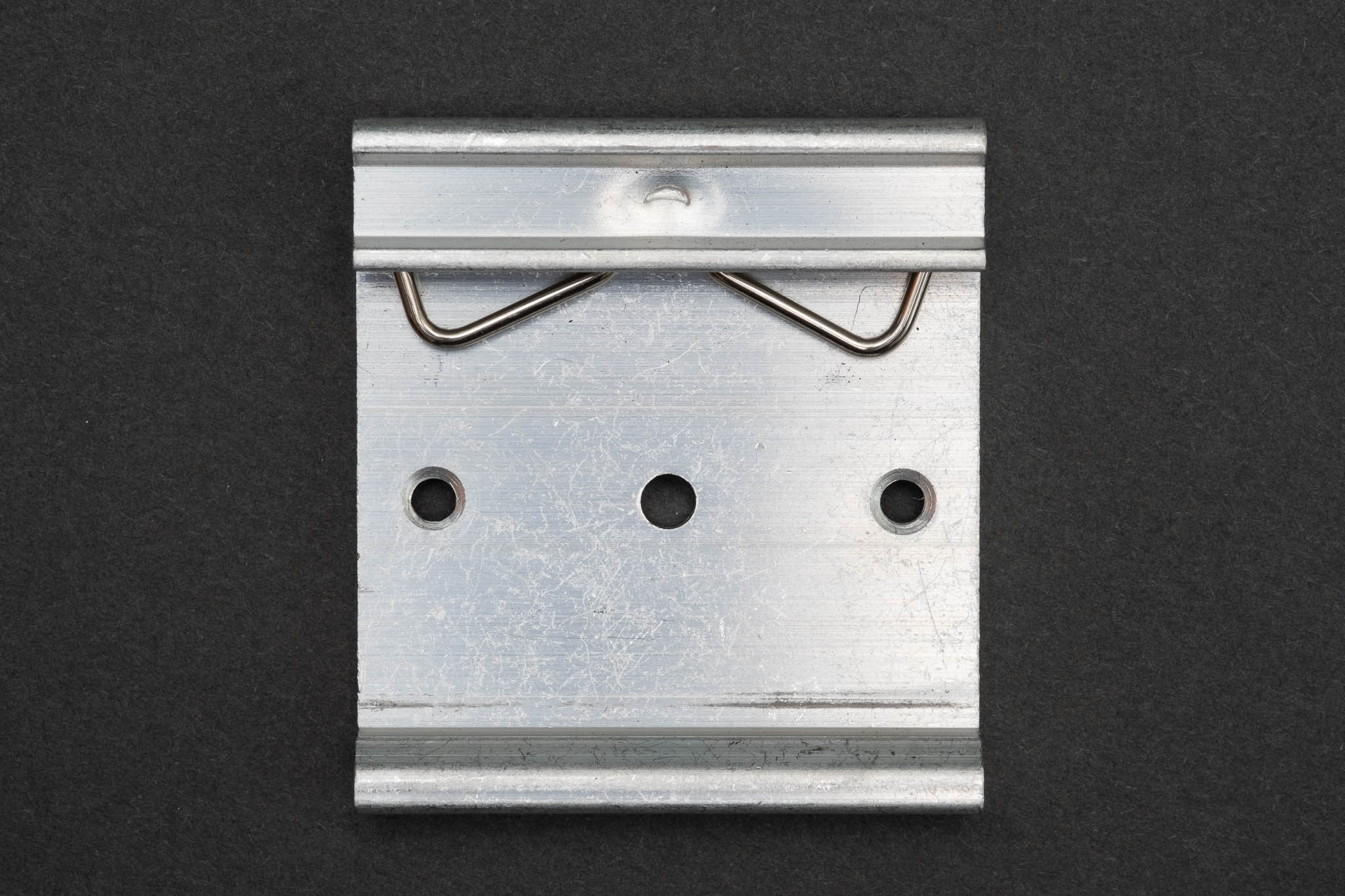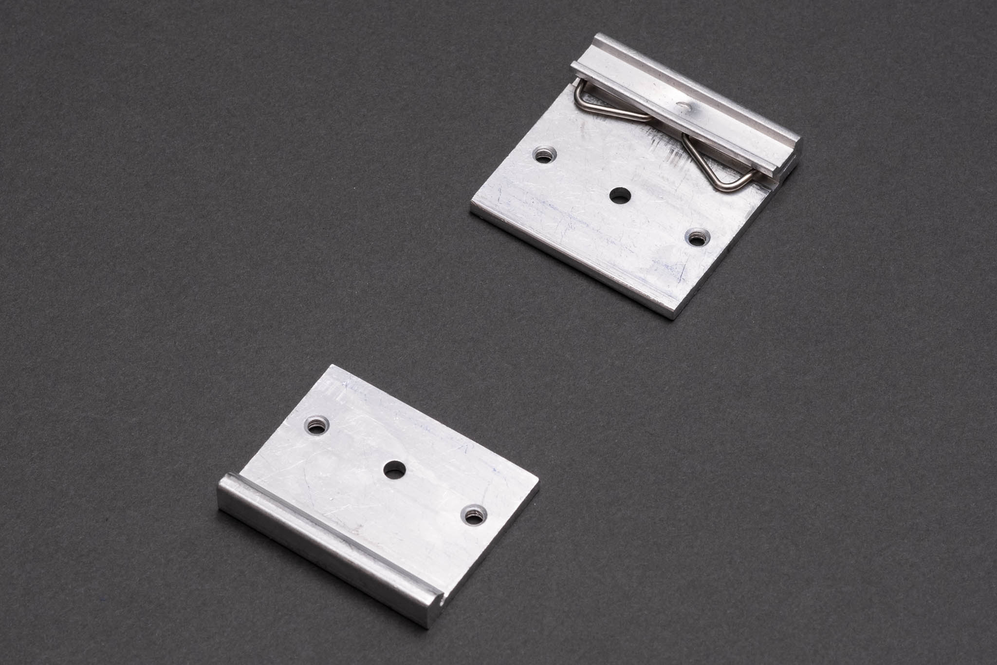 • 2 x DRP-03 DIN rail power supply plate (Mouser, Digikey, Time, Ebay, powersuppliesonline.co.uk etc). These need to be cut to create one fixed end and one sprung end. I used a chop saw but a hacksaw or grinder would work too. File or deburr the cut edges if needed.
