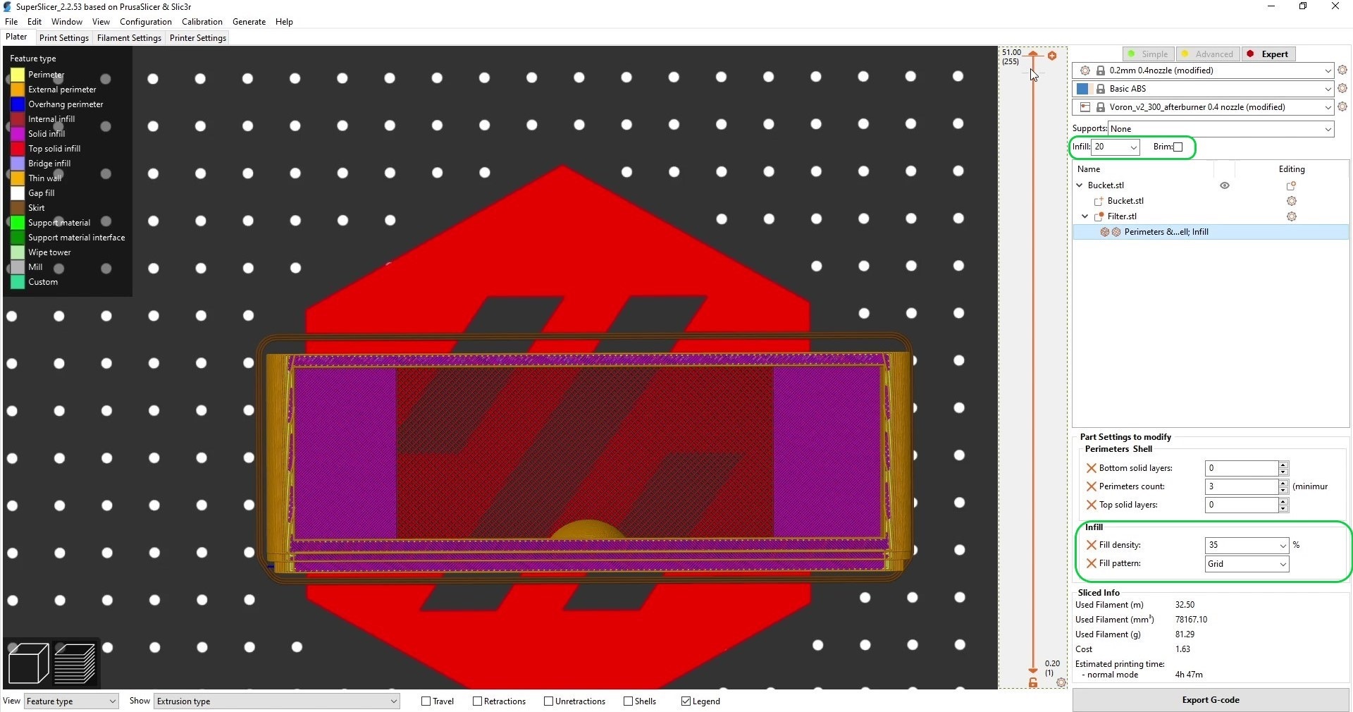 I have attached a few screenshots of how to prepare the print with the filter dummy file. The green options shown in the last two screenshots are optional. Either you set the infill of the whole bucket higher or you add another setting for the filter dummy. Except for the top end, the print consists of walls only. Make sure that the filter dummy and the bucket are centered. If you want to move them, then select both at the same time so you don't change the cropping area.