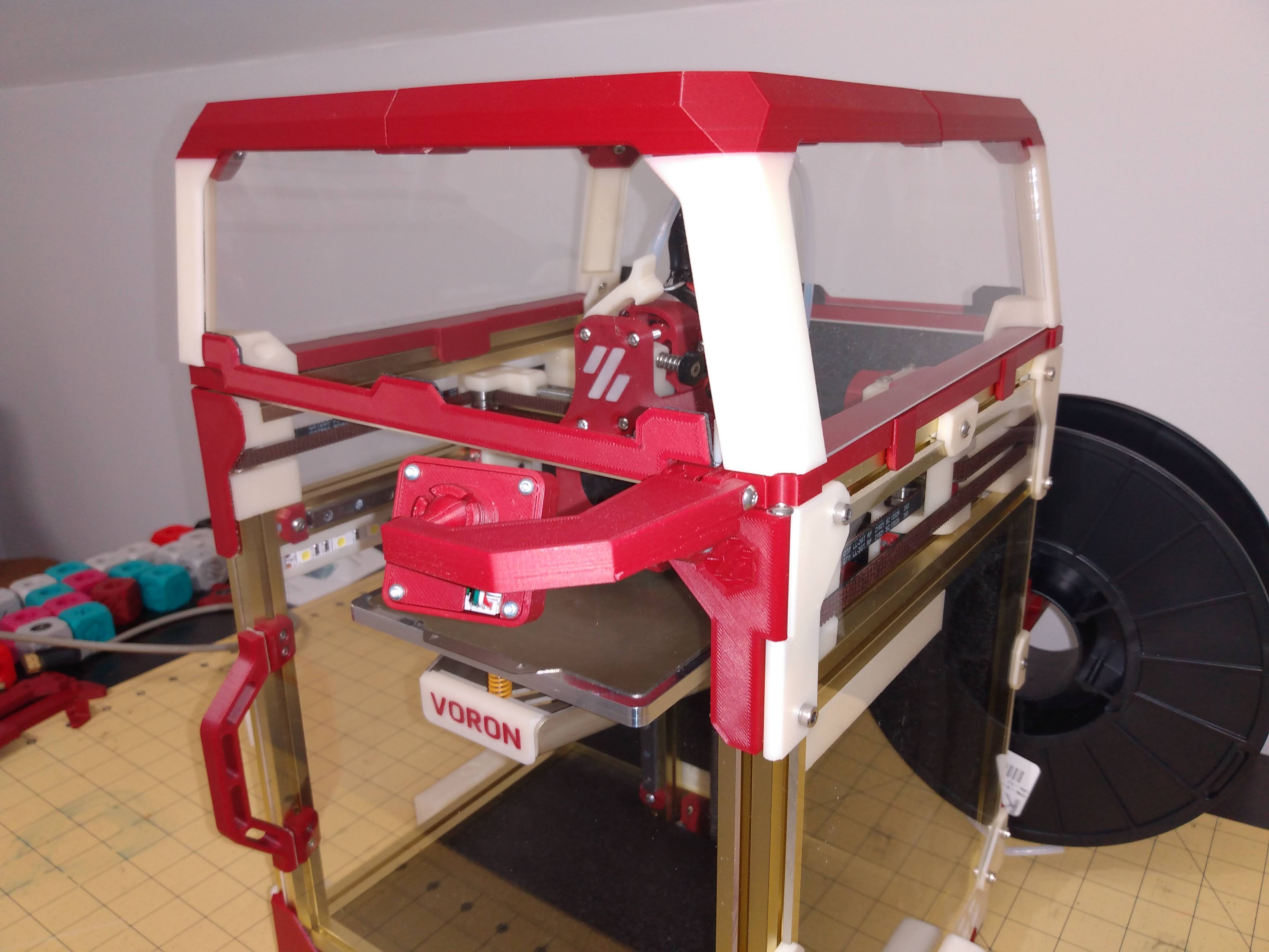 The parts for this mod should be printed with standard Voron quality settings. It is assumed that they will be printed on a Voron V0 or V0.1. All parts in the top-level STLs folder can be printed on the 120x120 bed. The Spacer parts have been split from the CAD in order to accomodate this. They will still need to be rotated 45 degrees to fit. (It is suggested to set the infill angle to 90 degrees to print the rotated parts.)